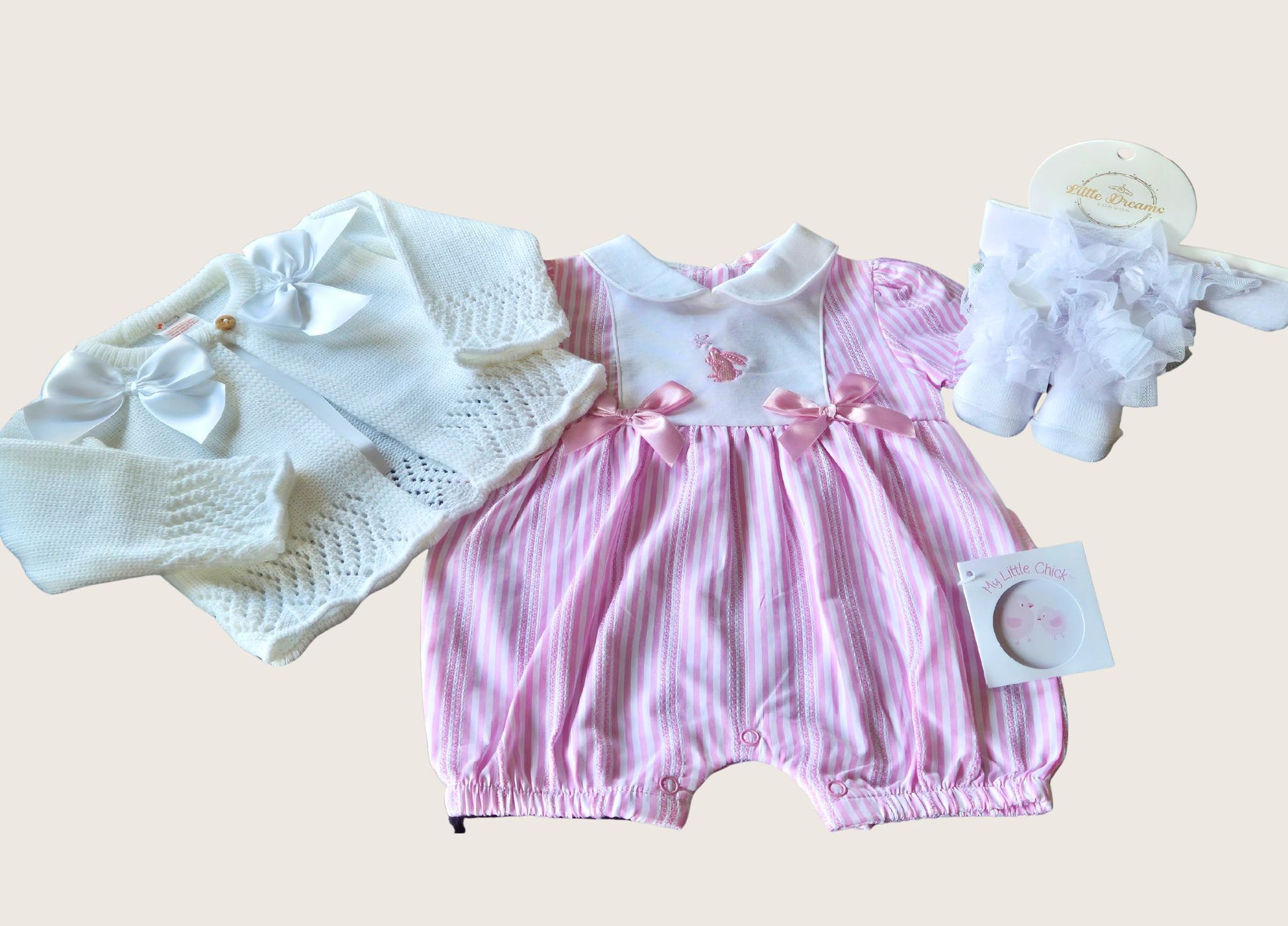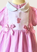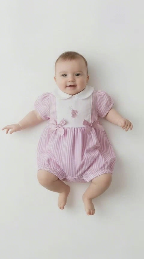 This beautiful baby girls pink candy stripe romper suit by My Little Chick is the perfect blend of traditional charm and sweet detailing. Designed in soft pink and white stripes, this short romper features a crisp white Peter Pan collar and a delicate white bib panel embroidered with an adorable pink rabbit gazing up at a star, making it an irresistible choice for Easter, spring and summer outfits.